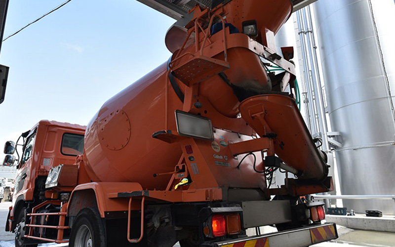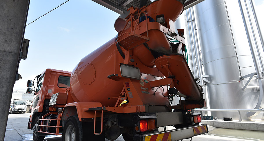 バッチャープラントで練り上げられた生コンは、ミキサー車へ積み込まれ、